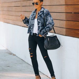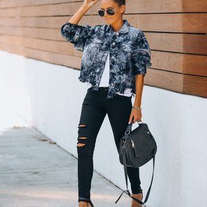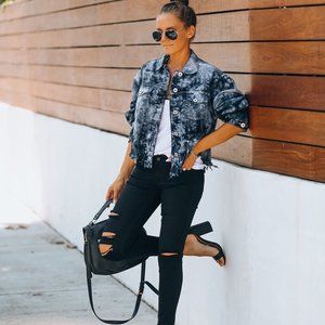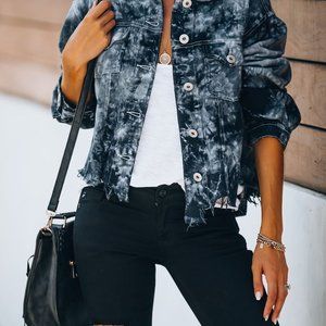Our hand dip dyed jacket will be all over your Instagram post within days. A french terry jacket with collar and button down closure on front and flap pocket on bust. Comes in a long sleeve with a band and button closure on hem. Lastly it brings out the unique boho vibe with our raw edge detail on front and clean band on back.