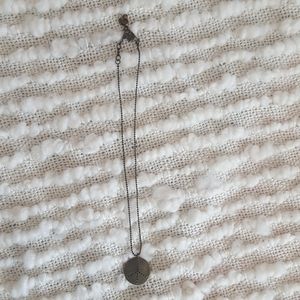 This necklace is super cool! It features a peace sign punched out of the metal disk. The pendant is on a ball chain. I would say the color is more of a blackened gold/bronze, which it that cool antique look