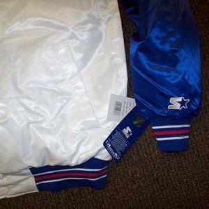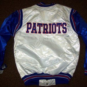 3X 4X 5X New FALL 2020 STARTER NEW ENGLAND PATRIOTS Snap Down Jacket. High quality polyester Satin Jacket with a snap up front and Nylon ribbed knitted cuffs, collar and waist band. The jacket has a polyester outer shell and the inside lining is soft diamond stitched polyester. The "PATRIOTS" Lettering & Logo are meticulously sewn on. Color: WHITE body with BLUE Sleeves & BLUE Sewn on Lettering with BLUE, RED & WHITE Trim. Measurements: 3X: 29" 4X: 31'" 5X: 33" across chest.