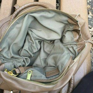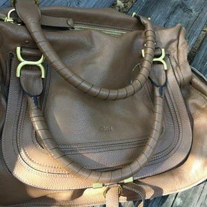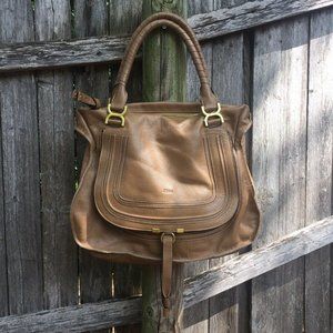 Very beautiful preowned Authentic Chloe Marcie medium brown tan leather satchel purse with double handles. Interior features a zip compartment. Also a large pocket under flap.