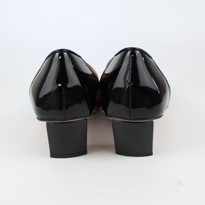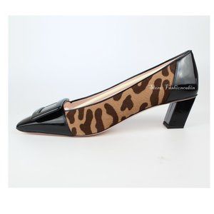 Roger Vivier 45mm "Belle Vivier" pumps in patent leather and leopard-print dyed calf hair (Italy).