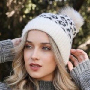 This incredibly soft leopard print beanie with furry pom pom is trendy and adorable. It has a ribbed border and fluffy faux fur pompom.
