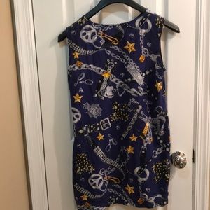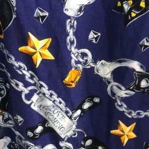 Love Moschino Blue Chain Dress w/ handcuffs, keychains, stars, fair bows, chokers, hair bows & etc! No size tag. Was originally listed as a medium from previous seller. As this brand is Italian, it runs very small. Features a side zipper. I thought the space to pull over your head area was small. This could look great as a tunic too. Year round dress, layer up with a cardigan for winter.