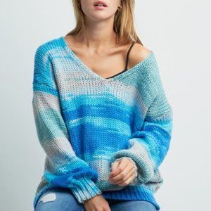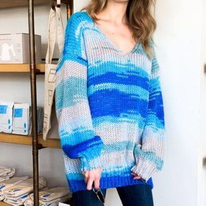 This Blue TONES Sweater is amazing, very comfy, semi oversized fit and the color combo is perfect. With Long sleeves v neck and semi oversized fit.