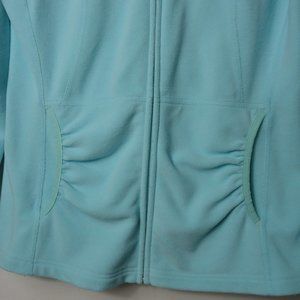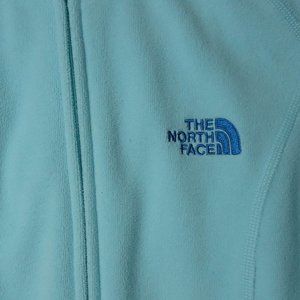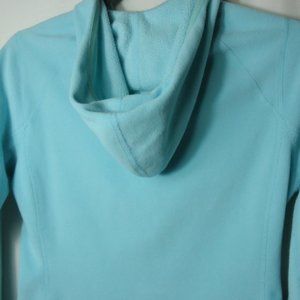 The North Face seafoam green long sleeve zip front fleece hoodie, size small. It is 100% polyester and is more of a seafoam green than blue in color...the pics look a little too blue to me...perfect for fall!