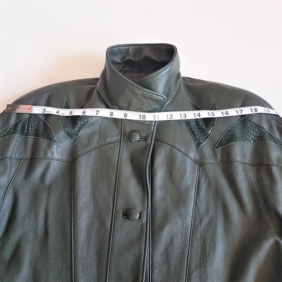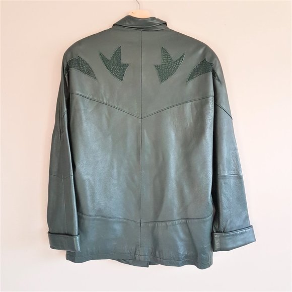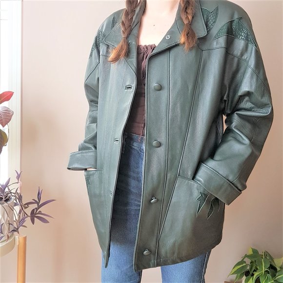 Vintage 1980s Boutique of Leather green leather jacket with leaves motif. Western style. Padded shoulders. Size M. Please see measurements. Pockets on the front. Lining on the shoulder area has red shade. Overall is great condition.