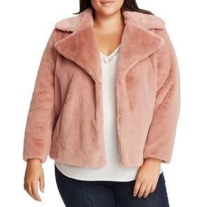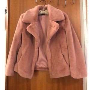 Luscious faux-mink jacket designed with a wide notched collar and cut to a cute hip-grazing length. Single hook-and-eye closure. Beautiful dusty rose color. Brand new, never been worn. Size small.