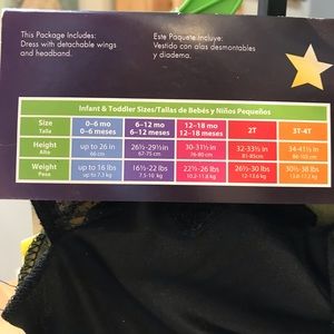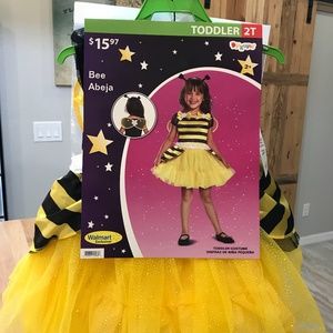 Hi Poshers. Featuring a Super Cute NWT Honey Bee Halloween Costume. This costume is adorable & fun. It's black, yellow & white in color w/stripes, polka dots, flowers & little bows. There's pretty, sparkly yellow & black tulle on the top of the skirt w/a satiny yellow skirt below & white ruffled piping above. Dress comes w/wings & an antlers headband to completes the outfit. Size is a 2T, so for 26.5-30 lbs. & height is would be 32-33.5 inches. Questions, ask. Happy Poshing!!!