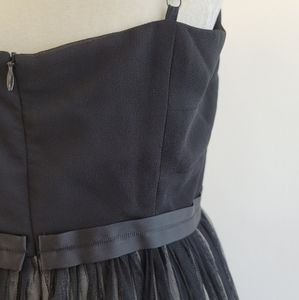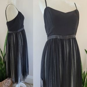 Channel your inner ballerina in a classically inspired ballet dress. Slender straps suspend the fitted V-neck bodice, lustrous ribbon wraps the waist and contrast-colored tulle lends lovely fullness to the midi-length skirt for an altogether charming design.
