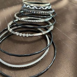 Darker bangle set from black to silver. These darker colored bangles definitely shine and are in good condition! 11 bracelets in total.