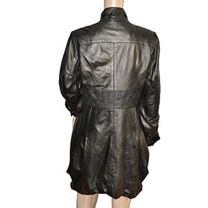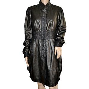 Offered is this stunning, rare vintage long jacket by Turkish designer Gian Mori, from my personal collection. The duster is dark pewter to black genuine leather with a slight sheen, and is the lightest leather I've appreciated in my 2 decades of sales. The coat features ruched gathered sides at the knees & tall mock turtle neck collar and a snap front closure.