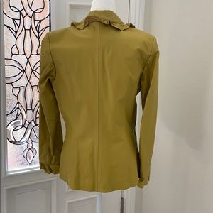 Worn once and is in brand new condition. 💯 % leather jacket made by Terry Lewis Luxuries design line. Beautiful mustard color and ruffles trim. Size runs big so this will fit better if you’re a small or 4 but just depends on how loose you like it fits