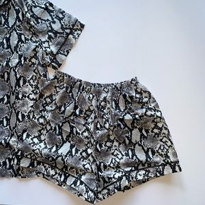 Features: Snakeskin, Black, Gray, White, Short Sleeve, Button Front, Short Set, Silk, Satin, Loungewear, Sleepwear