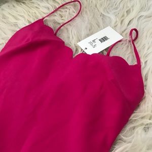 Adjustable shoulder straps, scalloped trim, fabric provides stretch