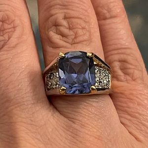 This is an amazing ring! It’s a doublet made of either natural sapphire crown & synthetic sapphire pavilion or natural garnet crown and glass pavilion. It’s hard to say on a mounted ring. The mount is gold vermeil (gold plated sterling silver). Stamped 925 for sterling silver and CL for the manufacturer’s logo / brand. A size 8.00 and in excellent vintage condition.