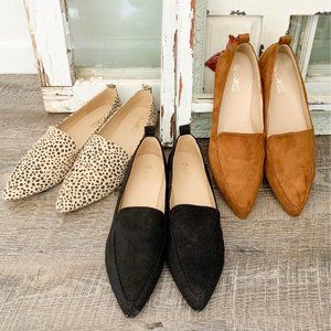 These loafer shoes come in three colors: Dalmatian Print, Black, and Dark Camel. They are perfect to pair with work wear or denim. 1/4 inch heel and made from man made materials. Good for both wide and narrow feet. THIS LISTING IS FOR DALMATIAN PRINT ONLY