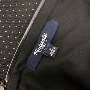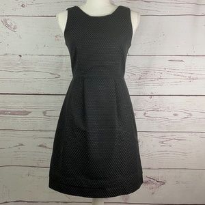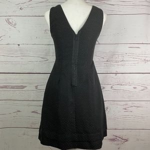 Fit and flare style, Textured fabric with small gold polka dots, Fully lined thick material, V-neck back with exposed zipper, Faux leather piping trim, Pockets, Lined