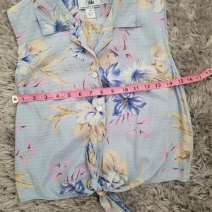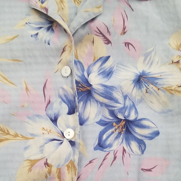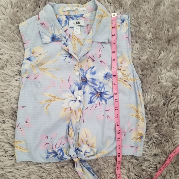 This collared top is 100% silk and is labeled Silks by Bill Blass Jeanswear. It has a floral design and 3 buttons down the front which leads to where it ties in the front. Excellent pre-owned condition with no flaws.