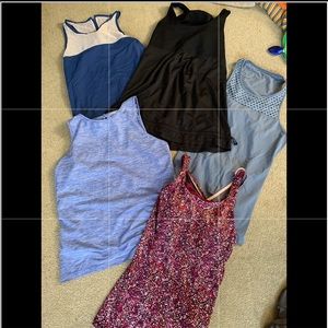 Size small workout tank bundle. Brands include Lorna Jane (dark blue and light blue tank with open back), old navy (black tank), vineyard Vines (blue muscle tank), and Gaiam (floral tank with criss cross straps on the back). Perfect for working out or as a re sellers starter pack! All In great condition. No signs of wear or tear, stains, or snags!