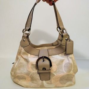 *Beautiful peach/pink, white, and grey Coach bag. The bag is canvas and leather with silver hardware.