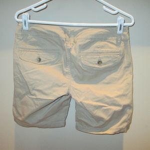 These low rise, longer style shorts are very comfortable and flattering. Khaki material. Sits mid thigh. Pairs well with just about anything. In good condition.