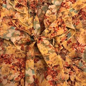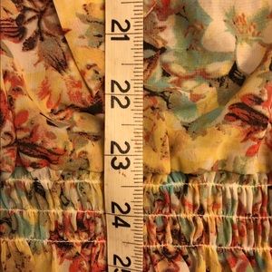 Beautiful Fall colors looks great with Philosophy sweater in my closet. 100% Polyester 25 inches long 20 1/2 inches across chest. Elastic gathering at waist. Bow tie at neckline.