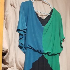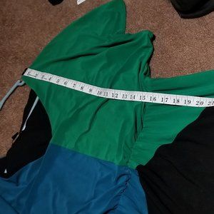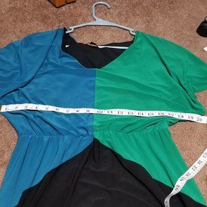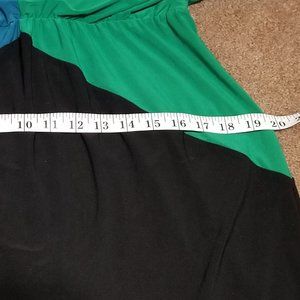 Blouson style top for looser fit on torso/chest with elastic waist. Unique color block combination of muted teal/turquoise blue, kelly green & black. Comfortable, flattering, professional & wrinkleproof! Wear with a jacket, or not, for work. Change into stilettos or sandals to transition after work. See pics for measurements, but allow for 1-2” extra with stretch. Medium weight, silky feeling nylon material. Wide short sleeves allows for comfortable draping around the upper arms. GUC.