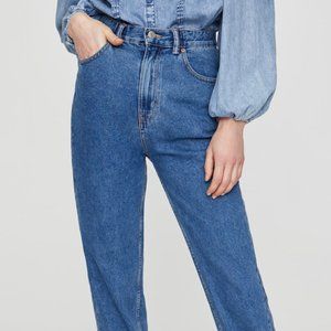 Pull&Bear basic mom jeans with a five-pocket design, belt loops and a zip fly and 4 button fastening. Dark blue color. Made of 100% cotton. Europian size 40. Mexican size 30. Worn but still in great condition.