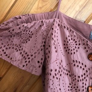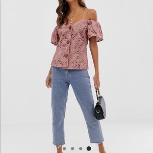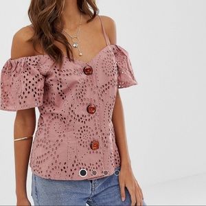 The perfect summer top! This off the shoulder top features slim cami straps, contrasting buttons & cute cutout detailing. Perfect with jeans or a denim skirt!