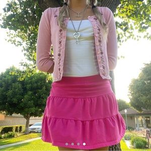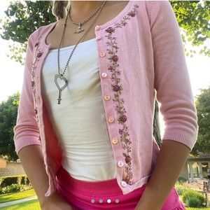 this cardigan is the softest thing, i love how delicate it is and all the details on it. the cardigan is pink with rose buds lining all in the front near the light pink buttons 💗