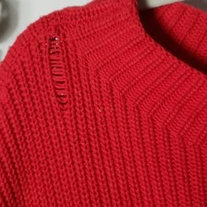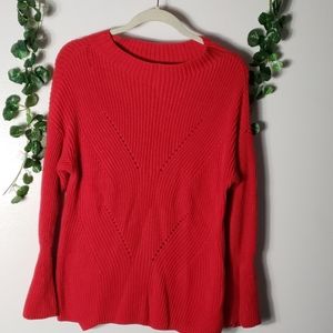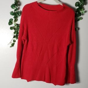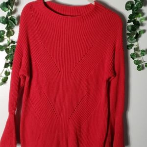 Beautiful red sweater... cute knitting design in the front. Bell sleeves hem.. two small splits at the sides.. Preowned but in excellent condition... just have small hole a thevtop.of the shoulder that can be fixed... price will reflect the defect...round neckline..long sleeves. Measurement armpit to Armpit 18inches Length 27 inches..Sleeves Length 26inches..60 % cotton and 40 Rayon...