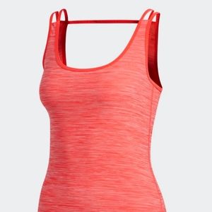 Bright heathered salmon color u back tank from Adidas. Made from stretchy jersey fabric and features a strap across the back for stay put coverage during work outs. Shoulders have double straps. The shirt has a wider cut through the body so it moves with you and doesn't ride up/cling. Scoop neck, deep U back. Great condition!