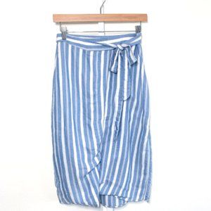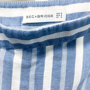 Bec & Bridge Wrap Skirt features a blue and white stripe pattern. Good condition, gently worn.