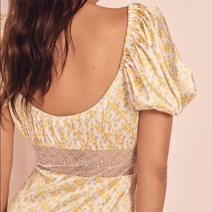 brand new and never worn! from the for love and lemons and Victoria’s Secret collab. soft Silk/satin material with amazing yellow floral pattern and lace details + puff sleeves. completely sold out. Size small