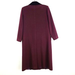 It's 100% wool in a ladies size small a long coat approximately 45 inches is mid calf length