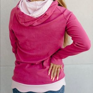 The DoubleHood Sweatshirt is cozy and adorable. With this being 95% Cotton & 5% Spandex, this is super stretchy! Pink allover with blush accents and scalloped trim.