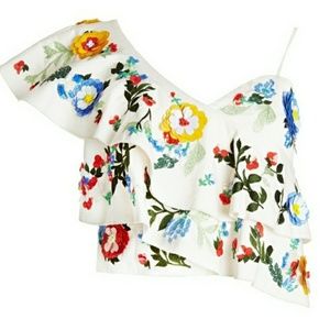 This cropped, one shoulder top features a constructed boned bustier with ruffles throughout for an extra bit of fun (it's spring, after all). Add in the embellishment hand sewn by artisans in India requiring over 15 hours of craftsmanship and you have the most gorgeous Spring piece.