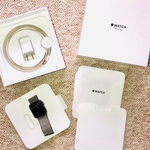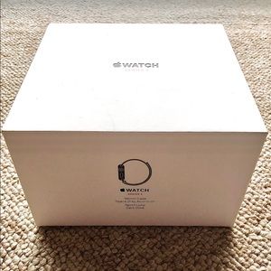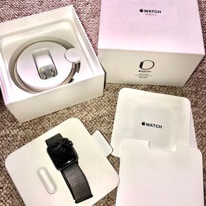 Items include: watch, band, box, instructions, charger, and charger box (planned to keep and replace screen however, received newer series as a gift for my birthday🎁)