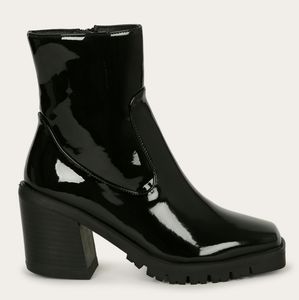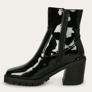 These ankle booties feature a square toe cap, lugged rubber outsole, stacked chunky heel, and a full side zipper closure.