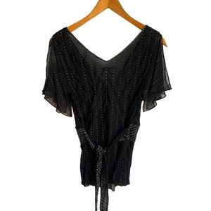 Adrianna Papell evening black beaded 100% silk top with slit flutter sleeves. I would say fits like a LP or a regular size medium. Previously worn and in great condition, missing 4 beads, two on the bottom front hem, and two on the back, as shown in the last 2 photos. Perfect top for a nice event!