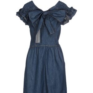 Features: Valentino dress, Valentino denim dress, Red Valentino dress, red Valentino denim dress, red Valentino denim bow dress, denim dress, denim mini dress, red Valentino mini dress, red valentino dress, red valentino ruffle dress, red valentino ruffle denim dress, valentino ruffle sleeve denim dress, red valentino bow