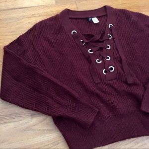 Knit maroon/burgundy sweater with lace up detail on the front. Has drop shoulders and a slightly cropped silhouette for an oversized, relaxed fit. Perfect for keeping cute and cozy this fall!