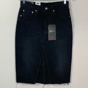 NWT! Levi’s deconstructed black midi skirt in size 28 which is a size 6/7. This classic midi skirt is very stylish with a front slit and cut off hem.