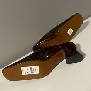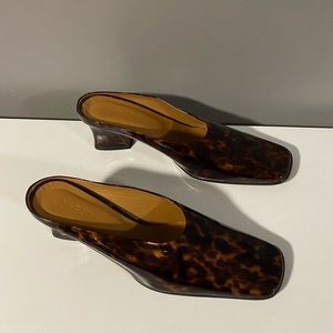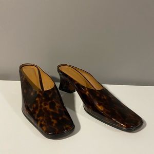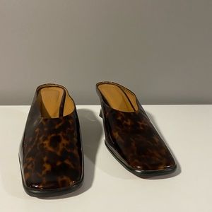 By Far Kim Square Toe Mule in Tortoise Patent Leather.