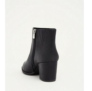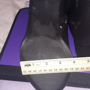 2.75" heel with a silver faux zipper on the outside. Functioning inner zipper and small stretch panel.