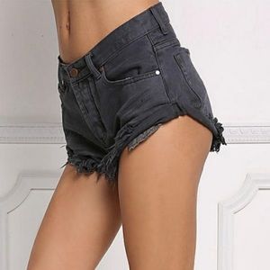 An essential pair of denim shorts solid all throughout. Feature low rise waist. 5 pockets, a front button with zipper closure, and half cuffed frayed raw cut hem. Has a form hugging fit. Comparable to One Teaspoon style shorts. Available in Charcoal, Nude & Burgundy.