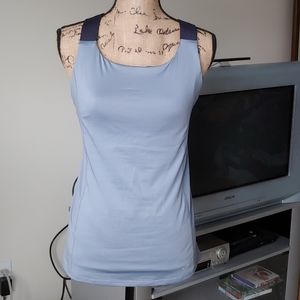 Super cute fashion tank that's also functional! Criss-cross straps add eye appeal in back, while built-in shelf bra gives support. Very pretty blue-gray color with contrasting straps. Worn once or twice, like new condition.