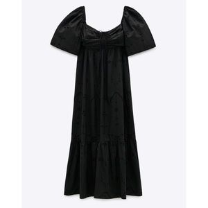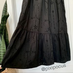 Black midi dress with round neck and cutwork embroidery detail throughout.