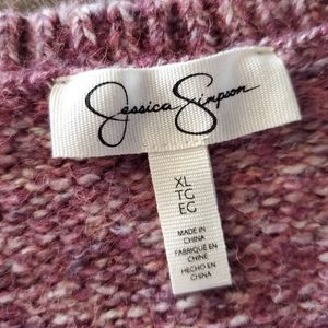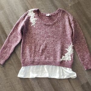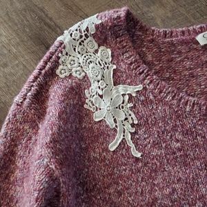 This scoop neck sweater is a heathered pink with lace embellishments with a faux undershirt look at the bottom.