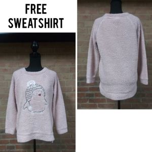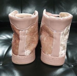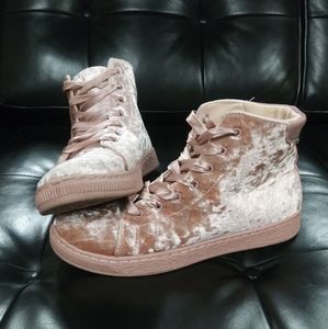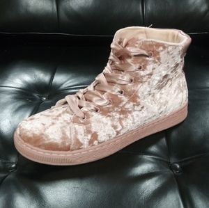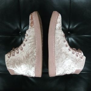 Women's powder pink velvet H/T sneakers with satin shoe strings & an accent glaze on the heels. Size: 10. Sweat shirt/ size: 8-10